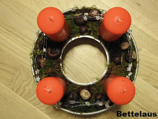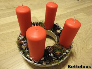 Årets adventskrans er ikke så meget krans, som det lyder til, men alligevel. Den er lavet i en gammel sandkageform, som jeg har købt på genbrug for lang tid siden. Nu fik den så nyt liv her i julemåneden. Kastanier er igen en del af det tema, som jeg åbenbart har kørende i denne tid. Ret ubevidst faktisk, men de er nu også fine.
